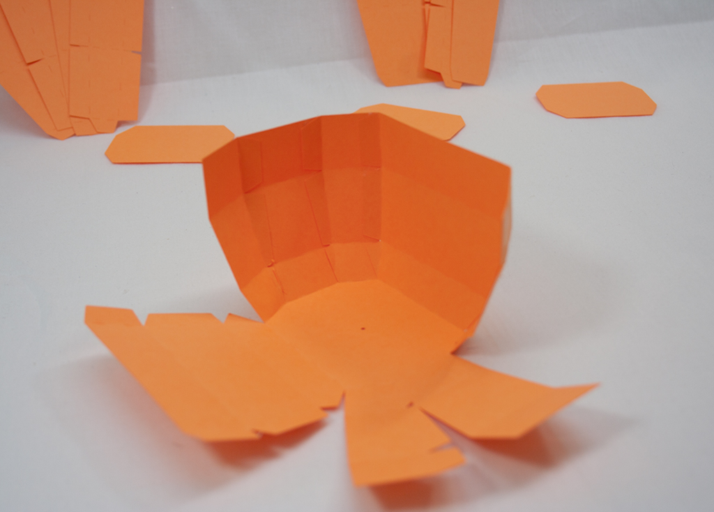 | 2. Starting with the lid, fold all your score lines up toward the middle. Start gluing tabs to adjacent pieces to form walls. Your lid is complete when all tabs are attached. |